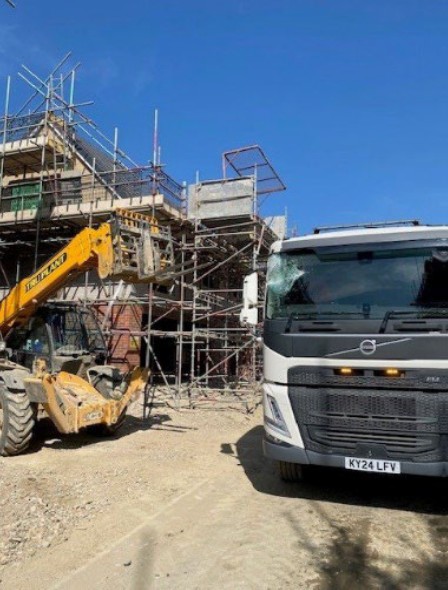 Due to restricted visibility caused by the surrounding scaffold, the operator of the telescopic handler did not observe an approaching concrete mixer vehicle. As a result, the telescopic handler made contact with the front driver's side of the mixer vehicle.