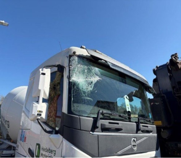 The incident resulted in damage to the windscreen of the concrete mixer truck.