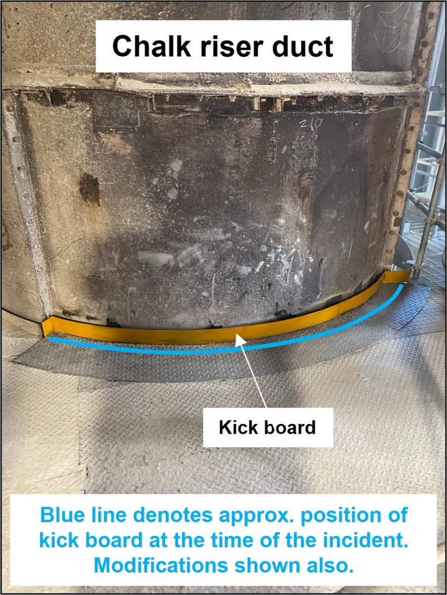 • The restricted space on the working platform, a result of the PHT’s design (including the routing of ducts), is a contributing factor. To improve the area, the kick board has been moved slightly closer to the duct – see below. Note: the gap cannot be closed completely, and therefore the kick board must remain in order to allow for thermal expansion – the duct runs hot due to process conditions.