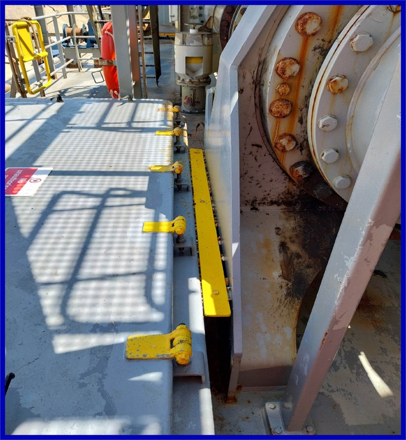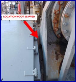While performing routine maintenance on a vessel, a crew member was painting the turning gland support bracket of the dredge system. To access the work area, he stood on the hatch cover, as illustrated in the attached photo. (Fig 1) As he repositioned himself and took a small step back towards the centre, his right foot lost traction on a hinge plate. This resulted in his foot sliding off the edge of the hatch cover and into the narrow gap between the hatch and the nearby support structure, the employee suffered a grazed shin and believed he had sprained his ankle, he was able to continue light duties the next day, however due to noticeable bruising the employee went to the medical centre for a check-up and was subsequently diagnosed with a small fracture to the bone in his right ankle, thankfully the employee has made a full recovery.