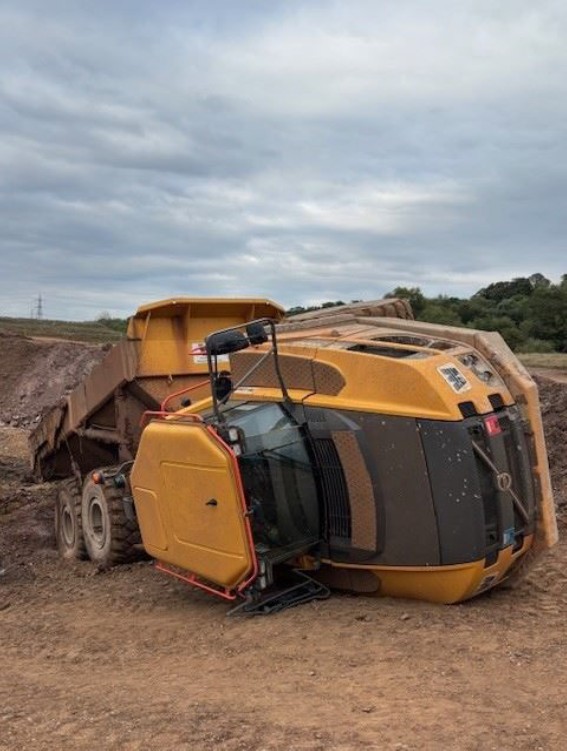 An articulated dump truck (ADT) operator was tipping wet material at a designated tip area, the tip had become full and this resulted in them reversing down and attempting to tip on a steep access ramp. The ADT’s inclinometer flagged the position as unstable. The operator moved forward to reposition, which caused the wet material to shift in the skip. After applying the tipping brake and selecting neutral, the operator was preparing to tip when the cab unexpectedly lifted and rolled over.
