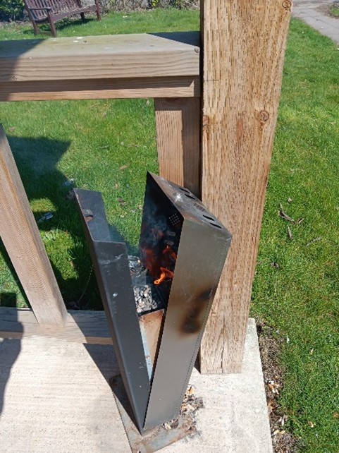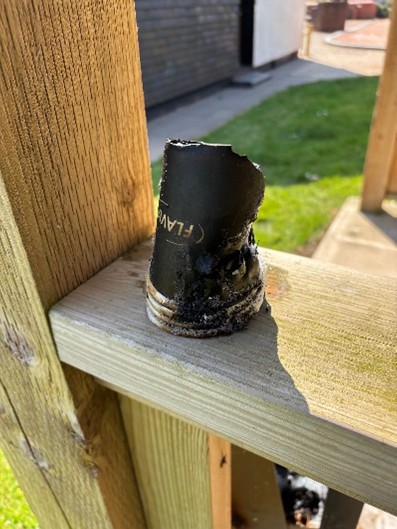 The incident where the bin was alight was caused by paper cups that had been placed within the bin, the unit overflowing and it had not been emptied recently. Looking around the area, there were discarded cigarette packets and other flammable materials present as well.