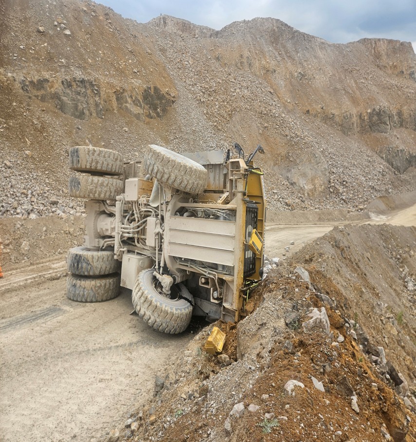A quarry operator was travelling back to the crusher fully loaded in a CAT 775G. The haul route had become slippery shortly after a down pour of rain. As the dumper approached one of the main ramps from the top of the quarry The operator engaged the correct gear with auto retarder. As the dumper descended the ramp at a speed of approximately 9mph it began to lose traction. The operator had no control over the steering causing the dumper to hit the bund on the opposite side of the ramp. The sideways impact of the bund caused the dumper to roll over onto the cab side and prevented a more serious incident. Luckily, the operator was shaken but thankfully unharmed.