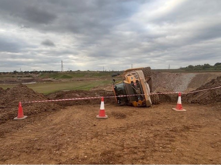An articulated dump truck (ADT) operator was tipping wet material at a designated tip area, the tip had become full and this resulted in them reversing down and attempting to tip on a steep access ramp. The ADT’s inclinometer flagged the position as unstable. The operator moved forward to reposition, which caused the wet material to shift in the skip. After applying the tipping brake and selecting neutral, the operator was preparing to tip when the cab unexpectedly lifted and rolled over.