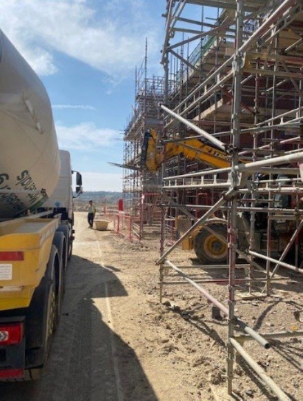 Due to restricted visibility caused by the surrounding scaffold, the operator of the telescopic handler did not observe an approaching concrete mixer vehicle. As a result, the telescopic handler made contact with the front driver's side of the mixer vehicle.